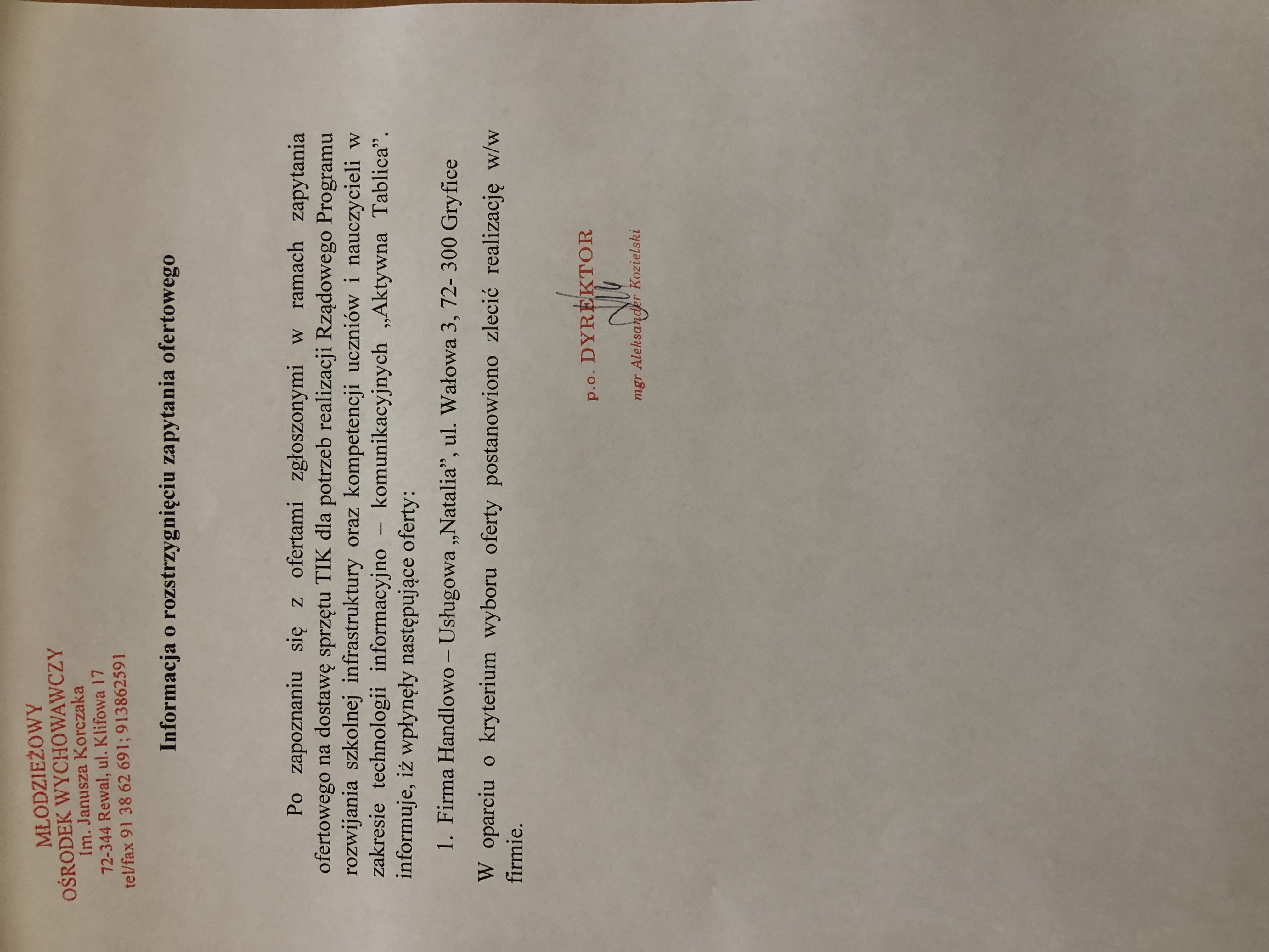 Informacja o wynikach postępowania